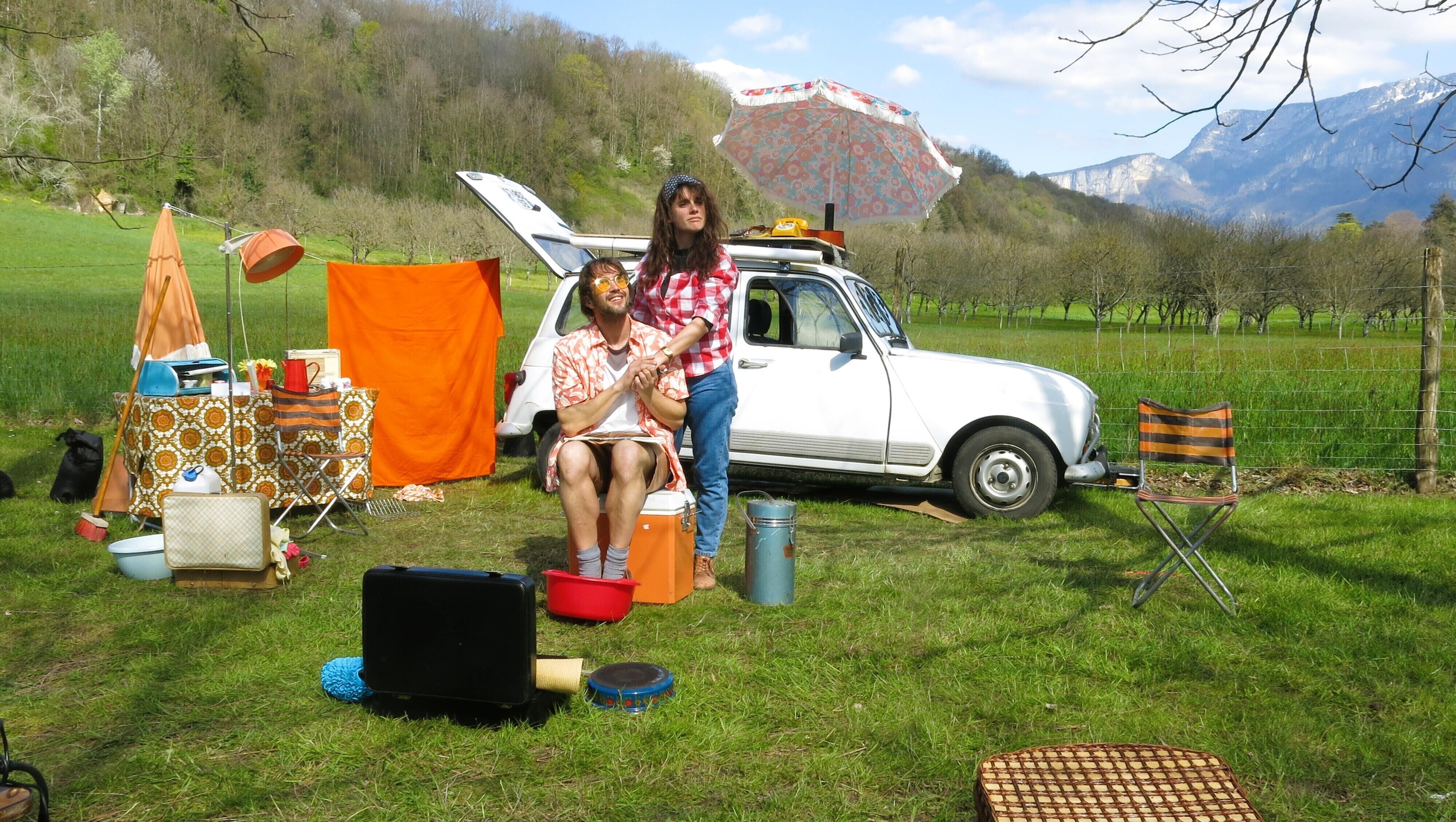 "Les folles vacances de Martine et Jean-Mi", c'est un spectacle de théâtre de rue musical, immersif et sonore dont la scénographie s'articule autour d'une authentique 4L et d'ustensiles de camping vintage.
